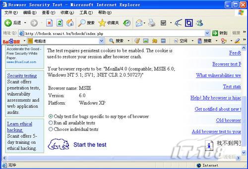 打开ScanIT网站页面,它首先显示出你浏览器当前所使用的版本,以及操作系统版本等等(图1)。了解一切后,其下方有三个选项第一个是Only test for bugs specific to my type of brwser(仅测试浏览器的Bug),这个只能检测19个项目。如果你想对浏览器全面检测,就选择第二项Run all available tests(对所有浏览器所有项目进行检测),这个检测项目包含了34项。再则你想自定义检测项目,可以选择第三项Choose individual tests(自定义检测,可检测16项),我们可以根据自身的需求进行选择。