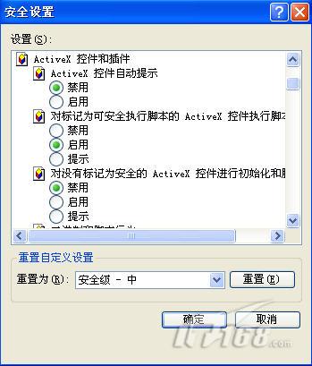 打开IE浏览器,依次单击“工具→Internet选项→安全”选项,在显示的“安全”标签里,单击“自定义级别”按钮,此时就会弹出“安全设置”对话框 (图4)。将里面Activex控件和脚本中的相关选项全部禁用,然后单击“确定”按钮使其生效。对于一些已经知道的陷阱网站可以建立屏蔽,例如这里依次单击“Internet选项”→“内容”选项,在“内容”标签的分级审查栏内,单击“启用”按钮,将想要屏蔽的网站地址输入到“许可站点”文本内,单击 “从不”按钮,就可避免自己以后踏入已知的恶意站点了。
