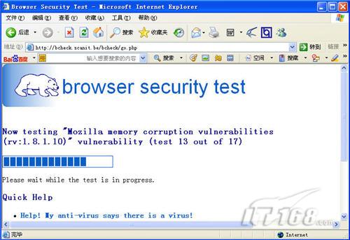 这里笔者选择的是第二项“Run all available tests(对所有浏览器所有项目进行检测)”,单击“start the test”按钮,此时就开始对浏览器进行“全身检查”了。在检查的过程中,它会不断的弹出窗口,并且还会显示出检测进度,以及一些相关的信息(图2)。等到检测操作完毕后,会显示出检测浏览器的一份安全报告,如果存在漏洞还会详细的显示出来。