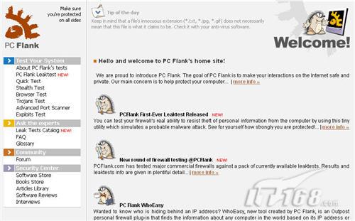 打开www.pcflank.com网站,左边已经为大家提供了7种安全检测方式:PC Flank leaktest(可以测试你的防火墙是否可以防止信息泄露)、Stealth test(隐身检测)、Quick test(快速检测)、Browser test(浏览器检测)、Trojans Test(木马端口检测)、Advanced Port Scanner(高级端口扫描)、Exploits Test(性能检测)