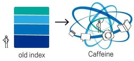 Google软件工程师Carrie Grimes说明了咖啡因索引系统与前一代索引系统的相异之处,指出旧版是由许多阶层所构成,某些阶层更新的速度快于其他层,但主要的阶层平均数周才更新一次,为了更新旧索引的阶层,Google必须分析整个网络,因此在新资讯现身及Google将其索引间存有不小的时间差。