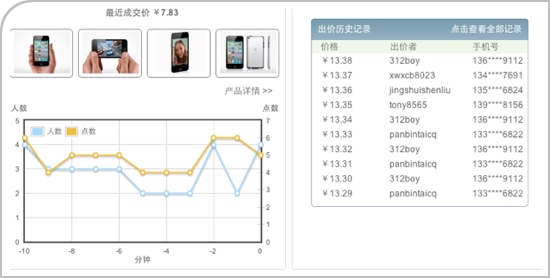 众多“点购网站”都在这个上面做出很多努力,比如,用户可以查询每个出价记录,可以得知出价者、出价次数,出价者的手机号码片段。在竞拍过程中,网站也提供了一些对竞拍者有价值的参考数据,比如“多少人在单位时间内竞拍多少次”。这帮助了竞拍者做好决策,同时也提供了相对透明、公正的竞价环境。