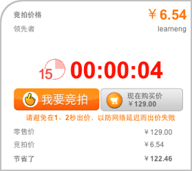 一种典型的点购模式是: 用户可以按照一定价格购买竞拍权利,每次竞拍为产品价钱增加0.01元,同时竞拍时间增加20s。如果产品竞拍倒计时为0时,没有其他人再次竞拍,最后一个竞拍者就可以以当前的价格(通常非常低廉)买走该产品。