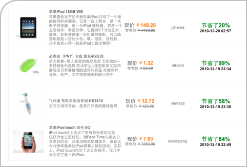 当竞拍时,每个正在被竞拍的产品都被网友高度关注。这也是厂家乐意看到的,因此会有很多厂家甚至愿意免费提供商品用来进行“点购”。产品被竞争的越激烈,人们对它的印象就会更加深刻,这要比被动的接受其它类型的广告要强很多。