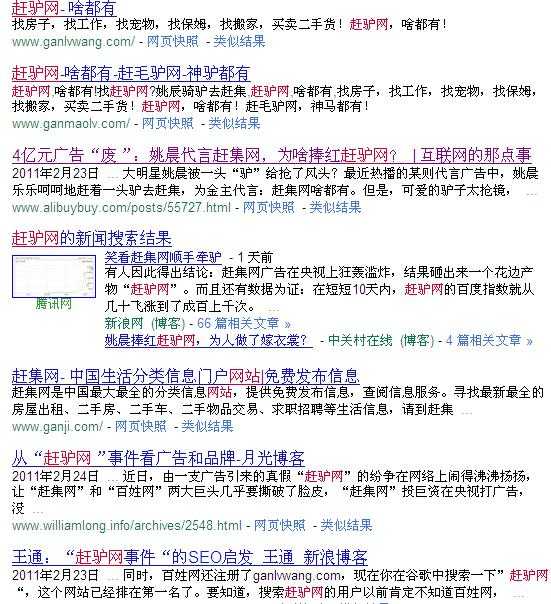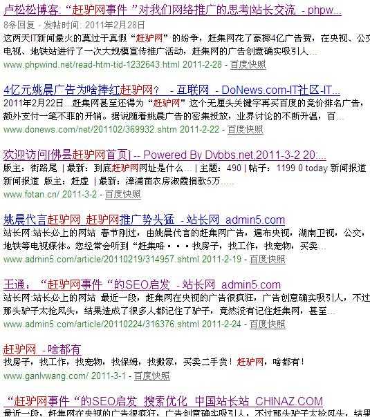 点评总结:赶集网最近的电视广告发力的很厉害,找姚晨等明星来发力,看来赶集在谷歌参股后的这几年沉寂之后,今年终于开始大规模推广了,至于有人有人传说“4亿广告打了水漂”,对广告稍微有点常识的人应该不会相信。广告的具体数字我也不清楚,但按常理分析,赶集网在央视的投入根本不可能有那么多。据笔者观察,最早的报道是说赶集网今年的市场预算有4亿,后来就被谣传成那个广告花了4个亿,但是连那个市场预算数据也没有人证实过,央视广告费4个亿又从何而来?当然你可能会说,中间冒出一个“赶驴网”来呀,赶集网不是给他人做嫁衣裳了吗?正好相反,为何小网站要山寨赶集网?这恰恰说明赶集网在央视的广告已经形成了巨大的轰动效应,已经成了一块不可多得的“肥肉”,勾引得小网站想靠近一点,希望分得一点残羹冷炙。这次的新闻事件的炒作,论策网络营销博客倒认为,赶集网才是幕后炒作的推手。很好的利用了网络整合营销的五大传播渠道:话题索引的论坛传播、人际索引的博客(微博)及SNS传播、公信力索引的媒体传播、被动索引的搜索引擎传播、视觉索引的网络视频传播。不得不说如此高明的营销术,不得不让人佩服呀。