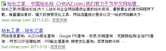 首先,我们来看一下site的一般用法,在百度搜索框输入site:chinaz.com,得到以下结果: