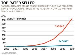 图为淘宝和易趣从2003年至2010年的交易额增长对比图,以十亿人民币记